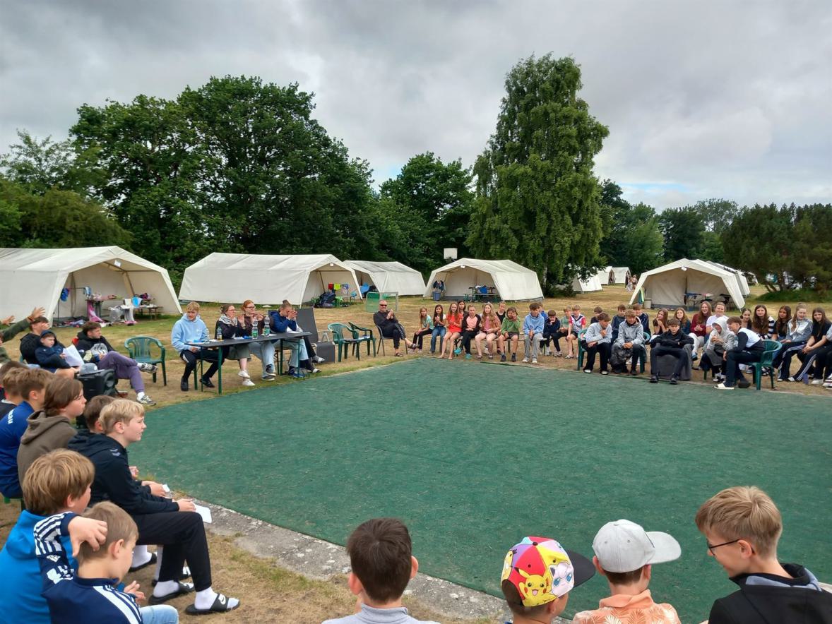 Der Dienstag startete mit dem ersten Geburtstagskind, das im Camp gefeiert wurde. Beim Frühstück wurde es mit einem Spalier und einem Geburtstagslied von allen herzlich begrüßt. Am Vormittag fand dann die große Talentshow statt. In diesem Jahr gab es eine besondere Überraschung: Auch die Betreuerinnen und Betreuer haben ein kurzes Lied eingeübt und eröffneten damit die Show – sehr zur Freude der Kinder. Eine Jury aus Betreuerinnen und Betreuern bewertete die tänzerischen, musikalischen und kreativen Beiträge – wobei der Spaß im Vordergrund stand und alle mit viel Engagement bei der Sache waren. Nach dem Mittagessen wurde im Rahmen des Förderprogramms „Beweg was! Camps“ in den einzelnen Zelten über sportliche Aktivität, Mitbestimmung und das gemeinschaftliche Miteinander gesprochen. Hierbei tauschten sich die Betreuer und Betreuerinnen mit den Kindern aus und notierten fleißig Wünsche und Ideen für zukünftige Zeltlager, freuten sich aber auch über zahlreiche positive Rückmeldungen. Besonders gefreut haben sich die Kinder darüber, dass sie viel freie Zeit haben und selbst entscheiden können, wie sie diese verbringen. Im Anschluss erhielten alle Kinder ein speziell gestaltetes Armband als Erinnerung. Am Abend sollte ein Völkerballturnier stattfinden, das aufgrund des Wetters leider abgebrochen werden musste. Doch der Tag war auch so ein voller Erfolg.